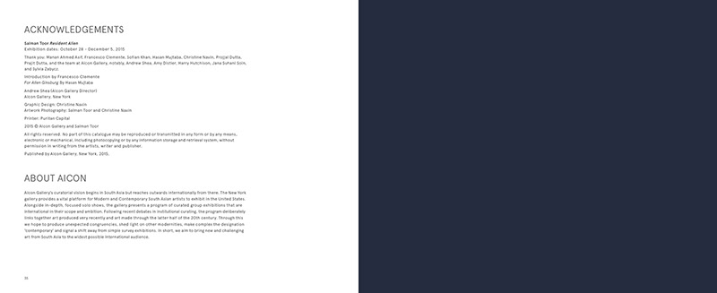 An art catalog for Brooklyn/Lahore–based artist Salman Toor. Collaborated closely with the gallery director on art direction, developing the visual approach and layout structure for the publication. Coordinated all print production with the vendor, overseeing proofing, color accuracy, and final output to ensure a high-quality finished catalog. See full catalog here: http://www.aicongallery.com/attachment/en/569f77d9cfaf347f2d8b4568/News/57c1ed4d8cdb50566d3a101c