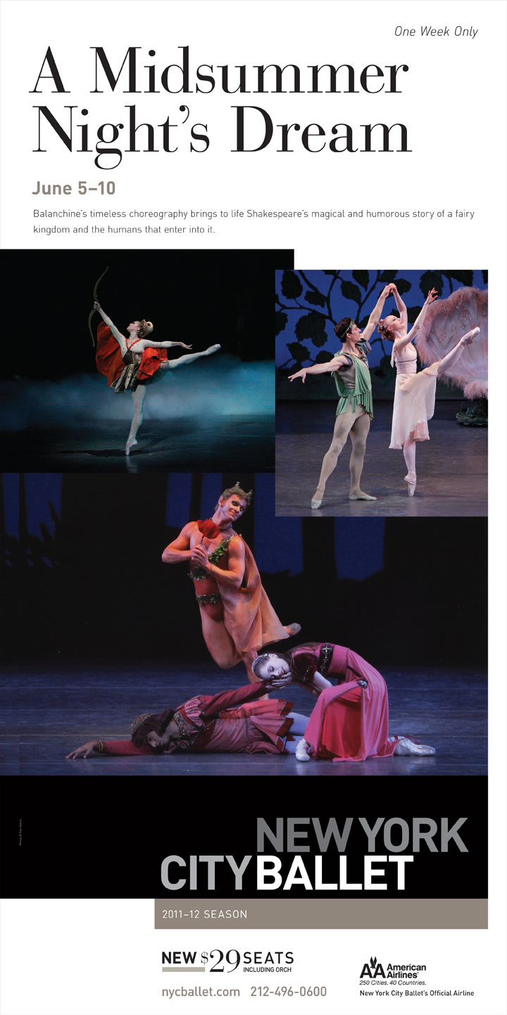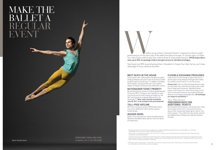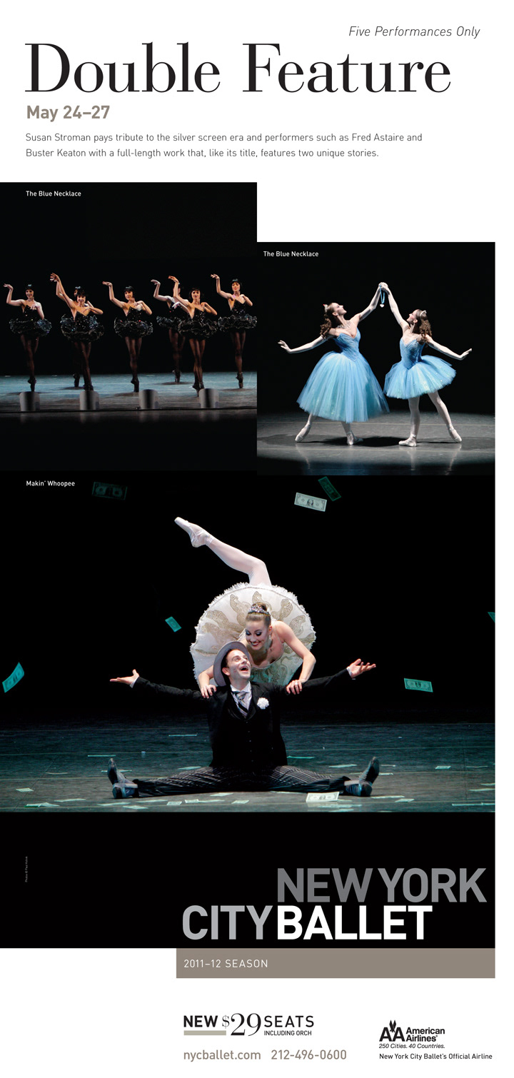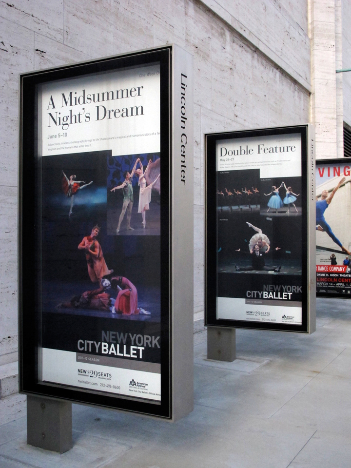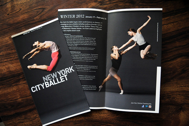 Worked with the design and marketing teams to execute layouts, adapt assets, and prepare production files for the New York City Ballet. This three-year campaign featured photography by Henry Leutwyler and included subscription brochures, monster banners, a poster/calendar, and a range of front-of-house posters promoting individual programs and ballets. The campaign aimed to introduce NYCB dancers to the broader NYC community and build greater interest among younger audiences.
