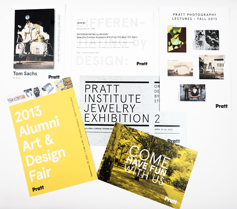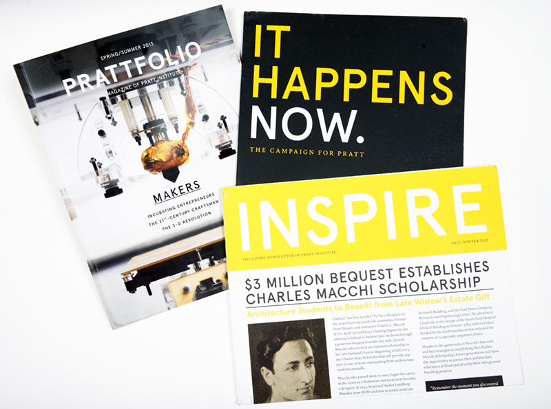 Art direction for various Pratt Institute print projects including Prattfolio alumni magazine, the Campaign for Pratt fundraising brochure, exhibition invitations, and alumni event materials. Led the redesign of Prattfolio to modernize the publication’s visual identity—introducing cleaner typography, a more flexible grid, and a streamlined layout approach to reduce clutter and create a clearer, more contemporary reading experience.
